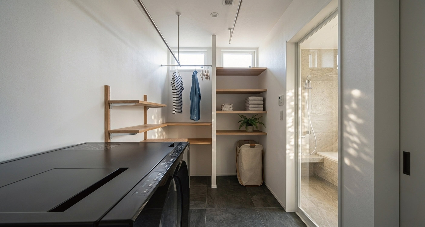室内干しができるハンガーパイプや、使いやすい収納棚も備え、日々の家事をしっかりサポートします。
